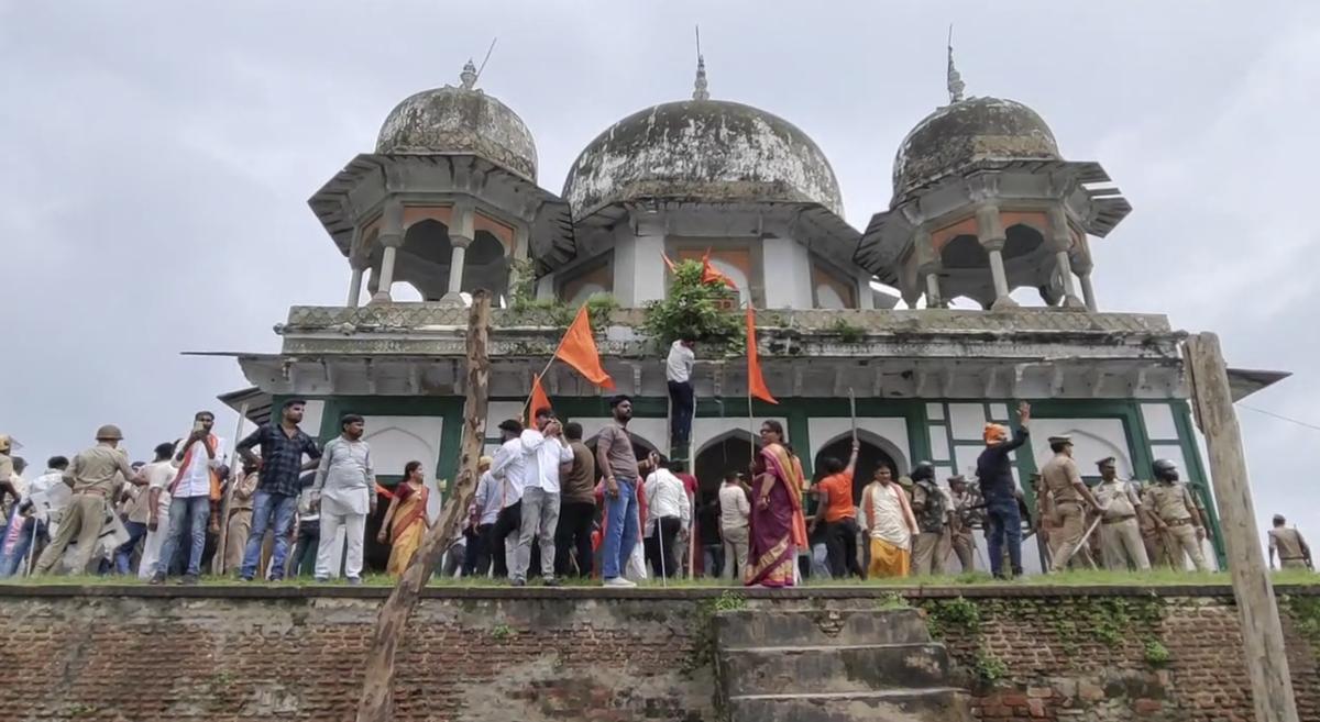 Locals present confirmed that around 1000 people from different Hindu organizations like Math Mandir Sanrakshan Sangharsh Samiti, Hindu Mahasabha and the Bajrang Dal, rushed into the temple around 10 am. They were chanting ‘Jai Shri Ram’ and climbed on top and hoisted a saffron flag. They claimed it was the site for a temple dedicated to Lord Shiva and Krishna.