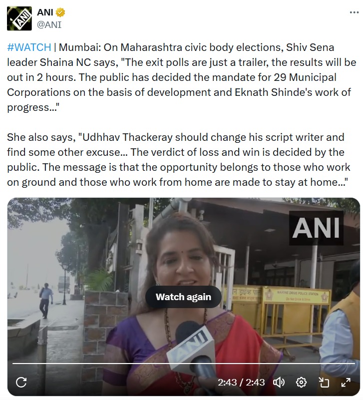 Amidst the Maharashtra civic body polls results, Shiv Sena leader Shaina NC says, “The exit polls are just a trailer, the results will be out in 2 hours. The public has decided the mandate for 29 Municipal Corporations on the basis of development and Eknath Shinde’s work of progress.” She also took a dig at Uddhav Thackeray, telling him to change his ‘script writer’. “The verdict of loss and win is decided by the public. The message is that the opportunity belongs to those who work on ground and those who work from home are made to stay at home,” she further added.