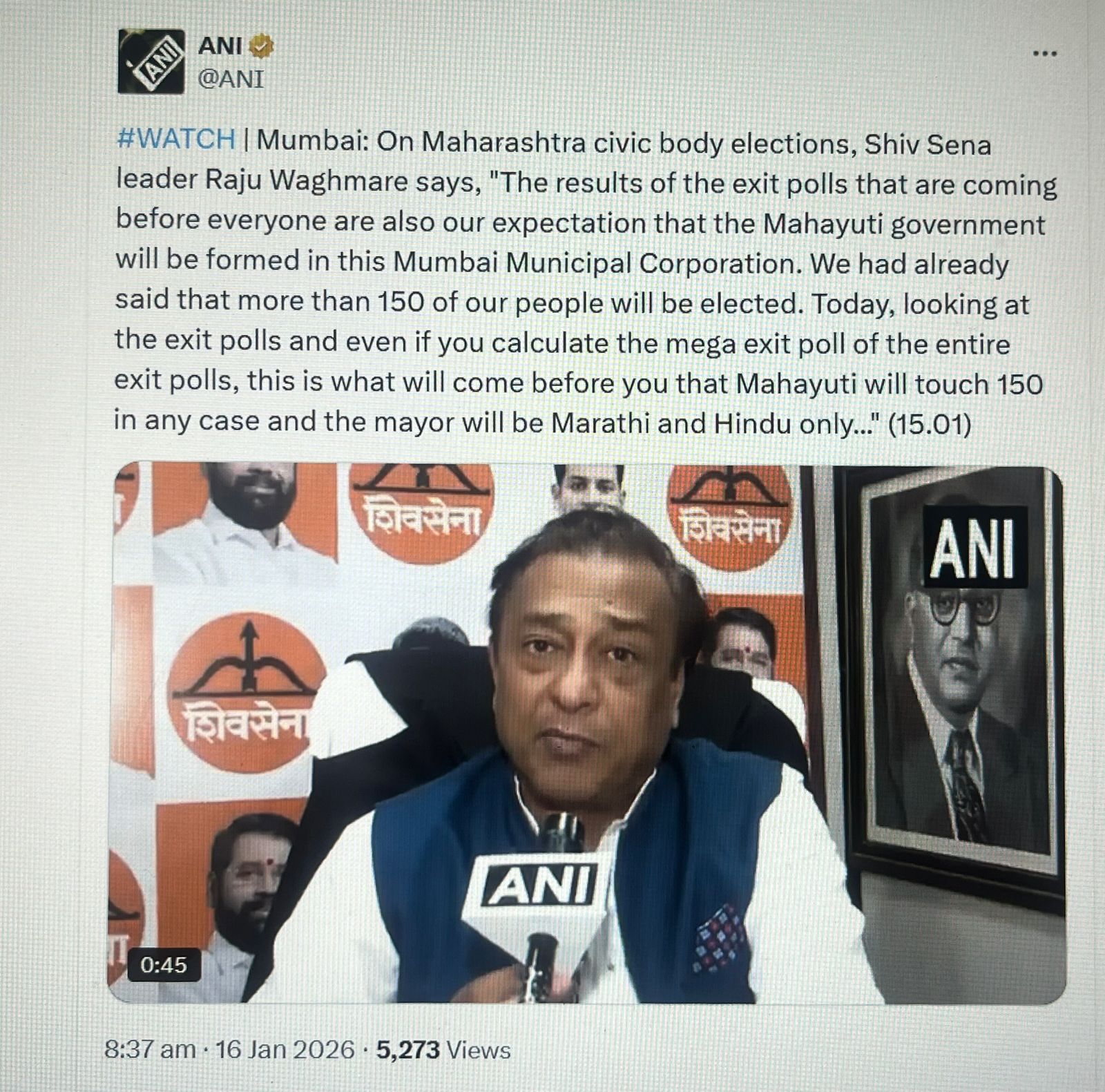 Shiv Sena leader Raju Waghmare claimed the Mahayuti alliance would form the government in the Mumbai Municipal Corporation and that exit polls were consistent with his party’s expectations. Waghmare stated that they had previously predicted more than 150 alliance candidates would be elected. He added that the Mumbai Municipal Corporation will have a “Marathi and Hindu” mayor only.