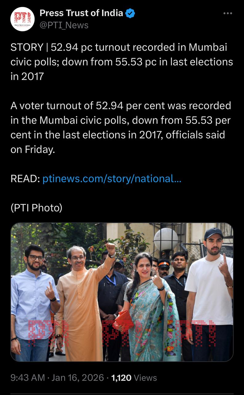 Mumbai’s Brihanmumbai Municipal Corporation (BMC) elections have recorded a turnout of 52.94% taking a sharp dip from 55.53% voter turnout in 2017. This clearly states that even after a fierce battle ongoing between Mahayuti and Maha Vikas Aghadi alliance the voter response has been lukewarm at best.