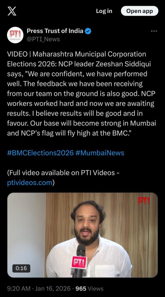 Nationalist Congress Party (NCP) leader Zeeshan Siddique states, “We are confident, we have performed well. The feedback we have been receiving from our team on the ground is also good. NCP workers worked hard and now we are awaiting results. I believe the results will be good and in favour. Our base will become strong in Mumbai and NCP’s flag will fly high at the BMC.”