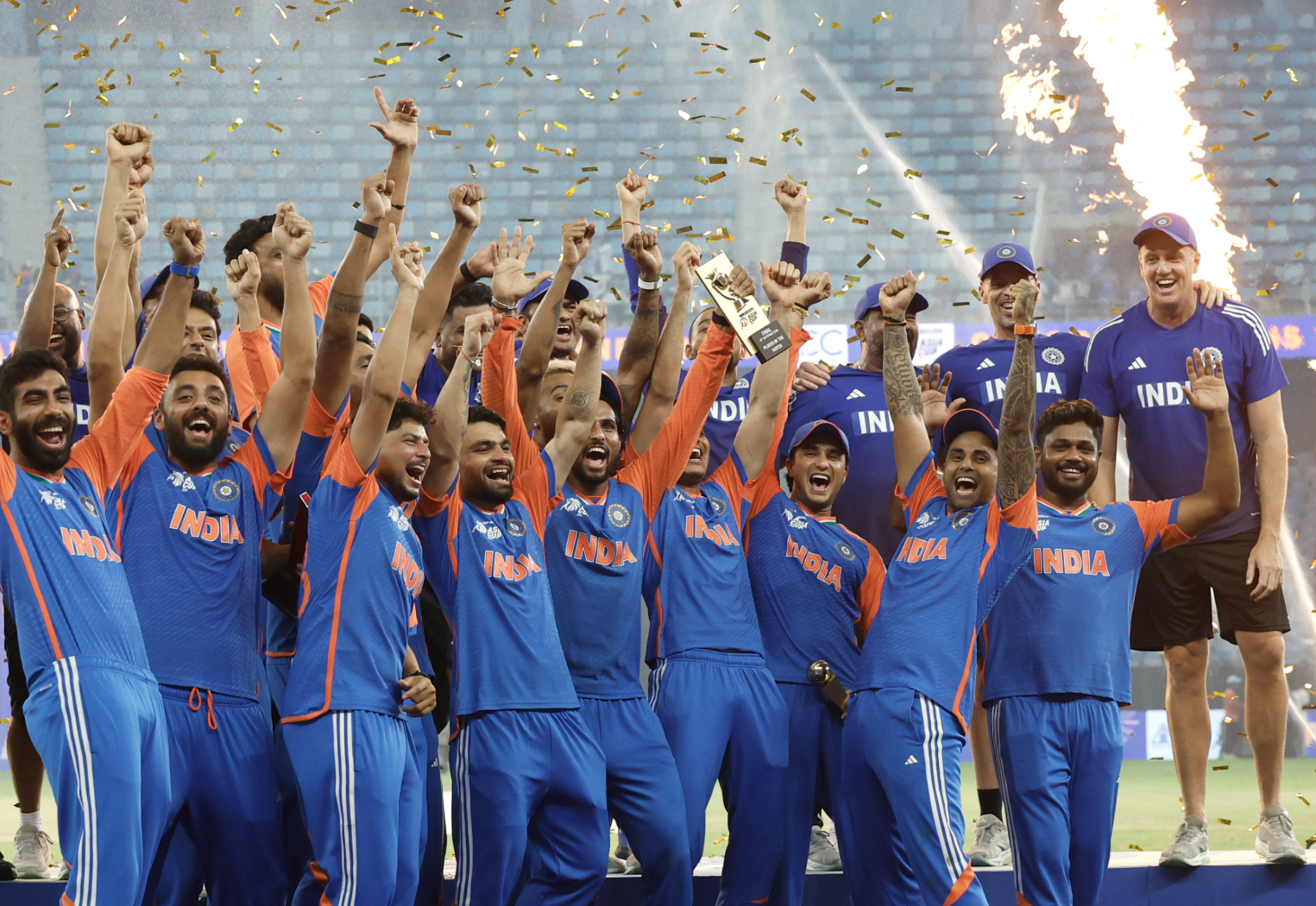 Denied the official trophy moment, India improvised. As captured in photos, captain Suryakumar Yadav and his teammates celebrated with a mock trophy, drawing laughter and cheers from the crowd.